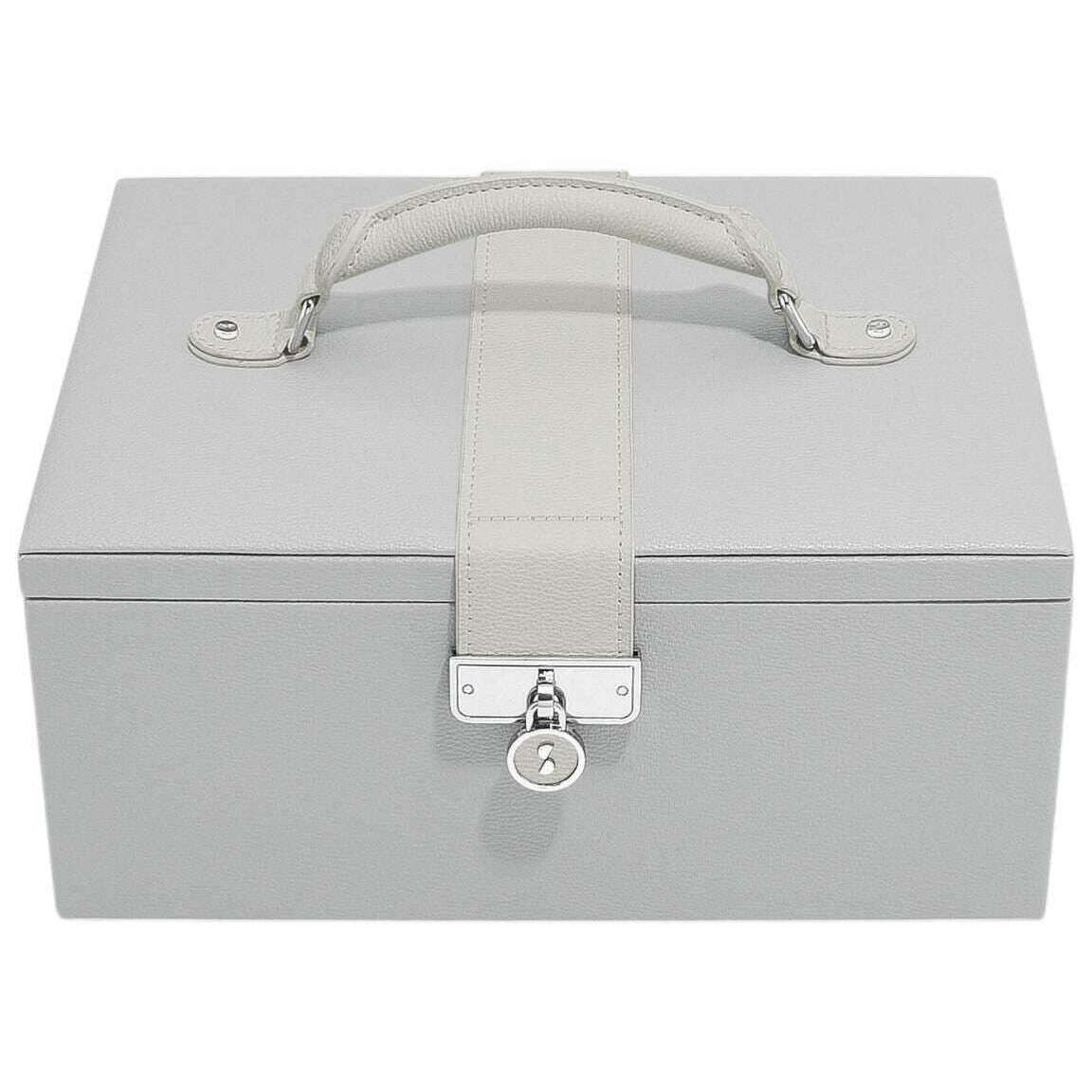 This well made women's luxury classic jewellery box from Stackers comes in a pebble grey colour and is manufactured from faux leather and velvet. It measures 16.3cm(height) x 25cm(width) x 18cm(depth). It is recommended to wipe clean to keep this jewellery box in good condition. All the jewellery boxes come complete with stackers packaging. The Stackers Luxury Classic Jewellery Box - Pebble Grey will look stunningly elegant on your dresser of vanity table while giving you stylish organisation for your jewellery collection. It opens up to reveal a practical mirror on the lid s underside, a top tray which includes a ring roll, long necklace section as well as multiple sections that you can use for other jewellery. Underneath the top tray is storage for chunkier jewellery with larger sections to give you flawless organisation. It can all be closed up with the popper closure and carried using its practical handle.