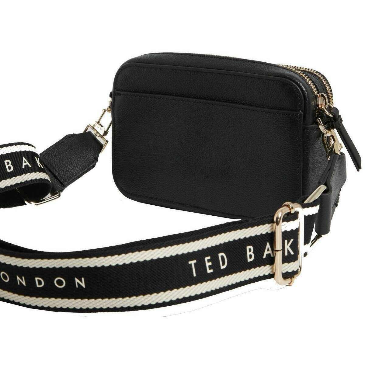 This women's linzie webbing leather small crossbody camera bag by the brand Ted Baker is made from 100% bovine leather and is showcased in black. It measures 11cm(height) x 17cm(width) x 5cm(depth). All the bags come complete with ted baker dust bag. The Ted Baker Linzie Webbing Leather Small Crossbody Camera Bag - Black is a stunning hands-free bag to ensure comfort and practicality. The double zip compartments, the internal side pocket and external back pocket allows extra storage to ensure all of your essential items are with you on the go. This stunning design features the signature logo, stitch detailing on the front and gold hardware. The detachable adjustable strap is co-ordinated with the colours featured on the bag itself allowing you it to match your outfits perfectly.