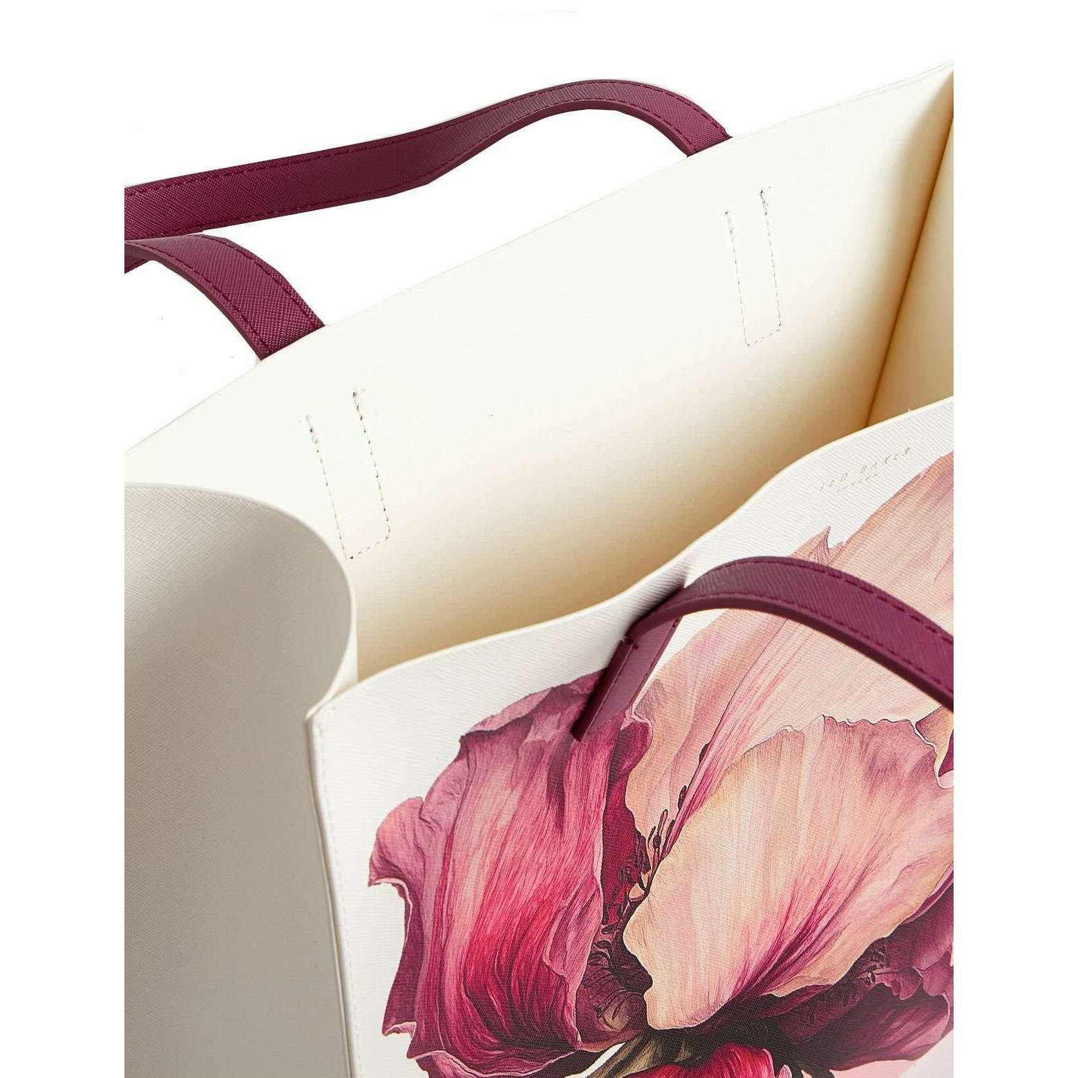 This women's shilva printed flower medium icon bag by the brand Ted Baker is made from 100% polyurethane and is showcased in pink. It measures 36cm(height) x 34.5cm(width) x 13cm(depth). All the bags come complete with ted baker packaging. The Ted Baker Shilva Printed Flower Medium Icon Bag - Ivory Cream/Rose Pink is a medium sized tote bag which is essential for daily use. Exhibiting a gorgeous floral motif with a neutral background and contrasting top handles. It offers a spacious interior, perfect for your essentials and is easy to wipe down and built for daily use with a high-end finish. There is printing across the base as well as embossed branding on the front.