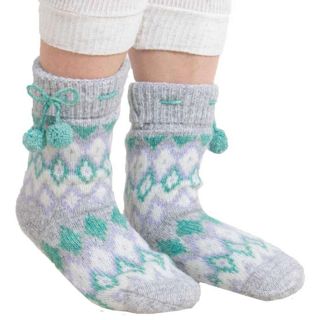 • Fair Isle Design , Fluffy Pom Pom Tie , Slip-Resistant Tread , Sherpa Lining