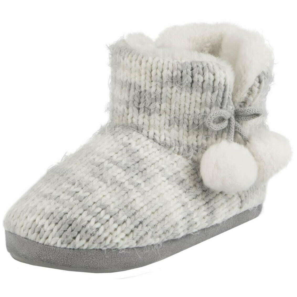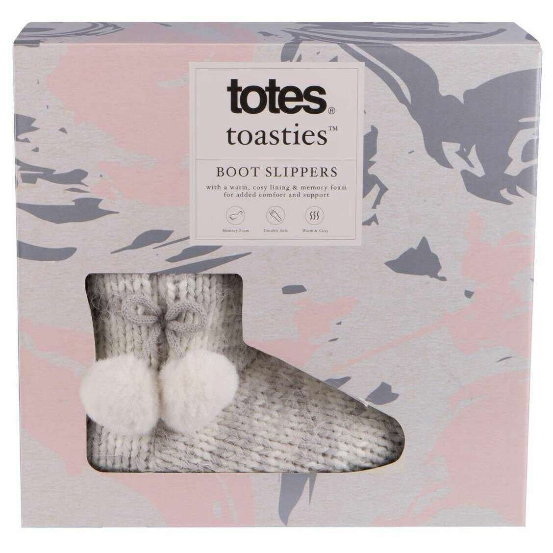 These women's space dye knitted boot slippers by the brand Totes Toasties are made from 60% polyester, 40% acrylic and synthetic suede and are showcased in grey. Also the grey slippers are designed in a 2-tone pattern, All the slippers come complete with totes toasties packaging. The Totes Toasties Space Dye Knitted Boot Slippers - Grey will pair perfectly with any of your wintery PJs for a complete cosy look to relax after a long cold day. The boot length not only keeps your feet cosy but also your ankles with the soft and warm faux fur lining, whilst the added memory foam ensures optimal comfort whilst walking around the house. Completing this look is the girly pom pom bow detail.