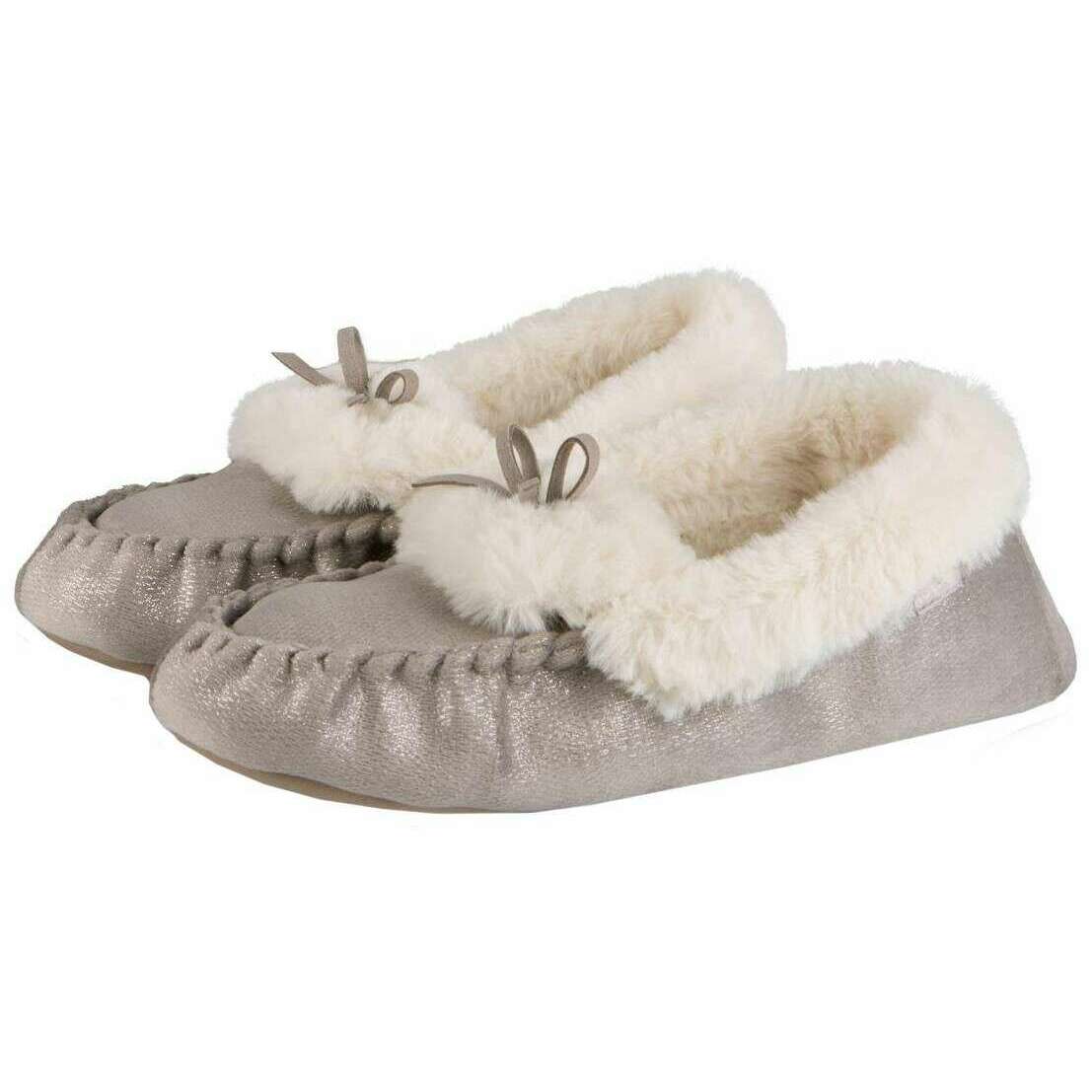 Introducing these women's sparkle moccasin slippers by Totes Toasties, they are manufactured from 100% polyester and textile tpr outsole in a grey colour. Also the grey slippers are designed in a plain pattern, All the slippers come complete with totes toasties packaging. The Totes Toasties Sparkle Moccasin Slippers - Grey features a classic moccasin design that has delicate feminine details with the bow top and the twisted front. Lined with faux fur ensures your feet are kept nice and toasty whilst roaming around the house with added memory foam and a durable sole for comfort and support. These will become your everyday pair that you slide into after a long day of work.