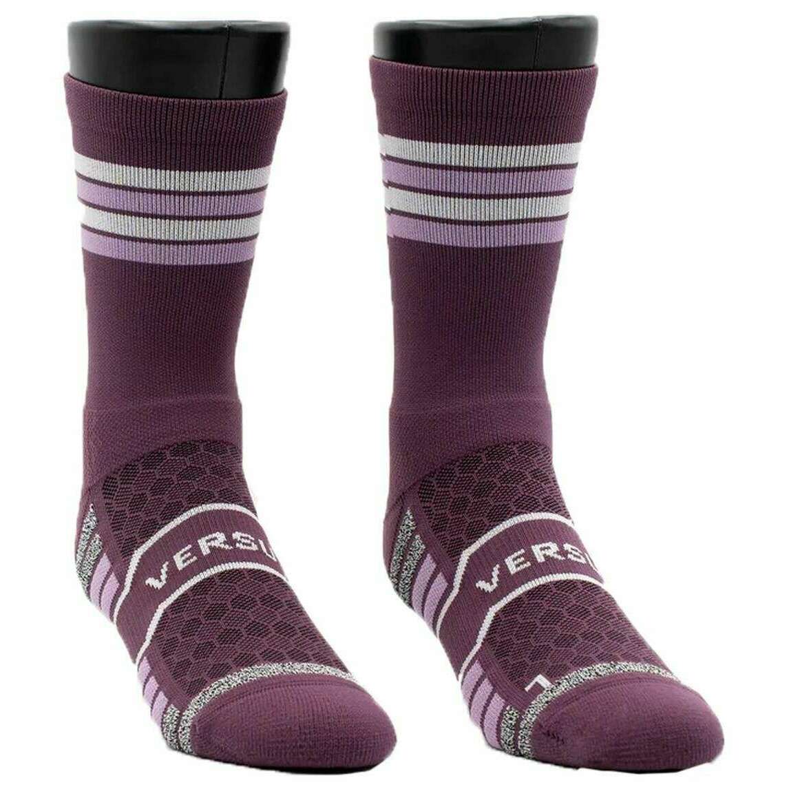 These unisex midnight trail running socks by the brand Versus are made from 96% nylon and 4% elastane and are showcased in purple. Also the plum purple socks are designed in a unique pattern, It is recommended to wash at 30 degrees to keep these socks in good condition. All the socks come complete with versus sock tags. The Versus Midnight Trail Running Socks - Plum Purple features style and high-quality technology, designed to support your arch and ankle throughout casual wear or intense activities like running, hiking and racing. These purple running socks are breathable and comfortable with its seamless design.