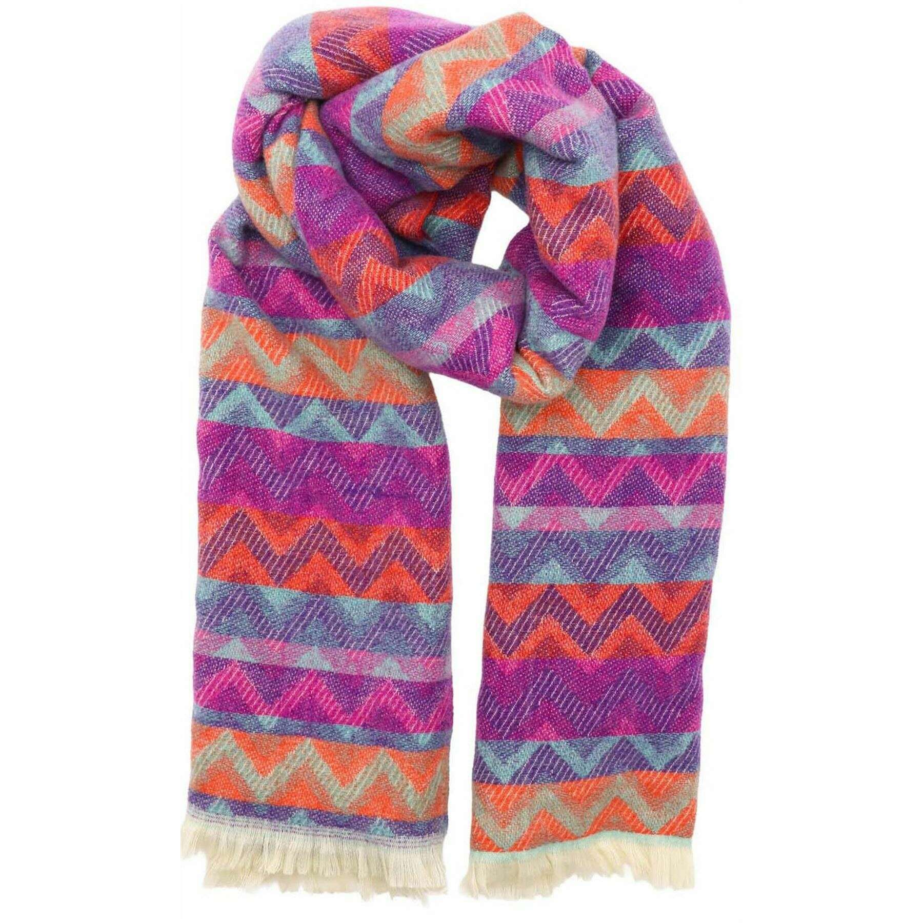 Brought to you by the brand Zelly, this purple women's zig zag winter weight scarf is made from 65% polyester and 35% viscose. It measures 180cm(height) x 65cm(width). It is recommended to machine wash at 30 degrees to keep this scarf in good condition. All the scarves come complete in zelly packaging. The Zelly Zig Zag Winter Weight Scarf - Purple is a vibrant choice for your winter wardrobe, making you look elegant and stylish while wrapping you up all warm and cosy. The beautiful soft fabric will give you the perfect winter hug when out and about during the cold weather and will brighten up your look, without compromising breathability making it a must have for your collection.